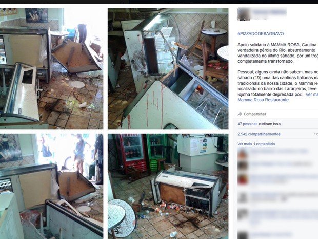 “Apoio solidário à MAMMA ROSA, Cantina Italiana, verdadeira pérola do Rio, absurdamente vandalizada no último sábado, por um troglodita completamente transtornado”, diz trecho da mensagem postada na rede social.