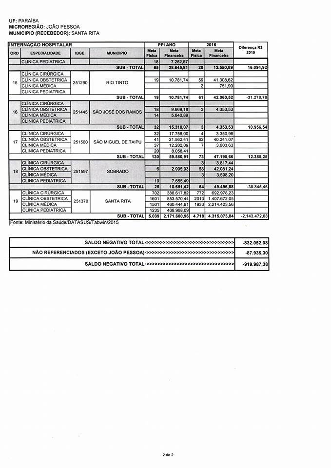 De João Pessoa, representada por um parlamentar da cidade, um número vultoso de procedimentos realizados em Santa Rita.