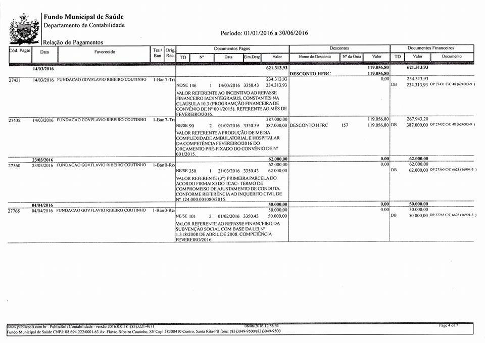 Ao todo a Prefeitura de Santa Rita envia ao Hospital Flávio Ribeiro Coutinho a quanto de R$ 1.094.313,93 (um milhão e noventa e quatro mil trezentos e três reais e noventa e três centavos), com o TAC incluso.