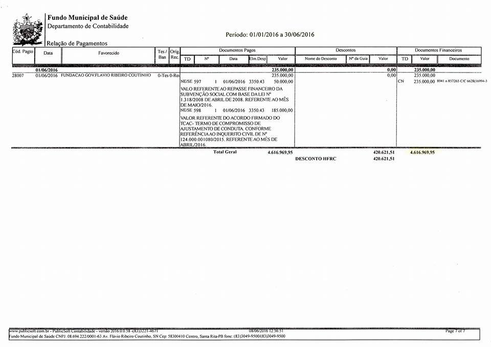 Além das obrigações pactuadas no TAC 001/2016 firmado com o MPF, o HMFRC contraiu empréstimo de R$ 2 milhões junto ao Brasdesco e a avalista desse empréstimo foi a Secretaria Municipal de Saúde, com autorização do Fundo Municipal de Saúde, tendo o SIA/SUS como garantia.