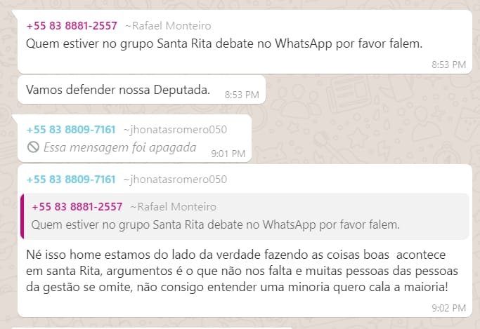 A postagem de Rafael Monteiro que é coordenador do Procon municipal (conforme print) e morador de João Pessoa, determina que “Quem estiver no grupo Santa Rita debate no WhatsApp por favor falem. Vamos defender a nossa deputada (Jane Panta)”. Tudo isso ás 08:53 minutos de ontem, exatamente no horário de expediente. Nota-se claramente o desespero para que os comissionados e contratados entrem no debate no grupo “Santa Rita debate”, pois naquele momento a primeira dama e deputada temporária Jane Panta estava sendo criticada por conta do linguajar agressivo e baixo contra o advogado João Alves Júnior.