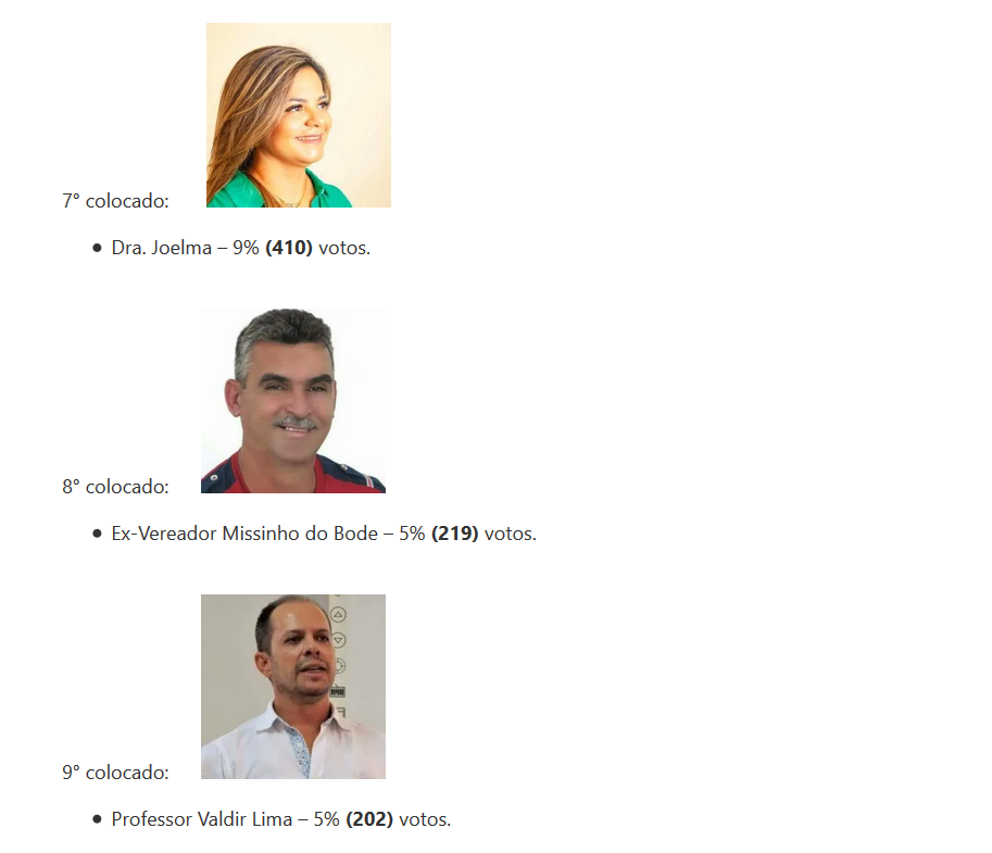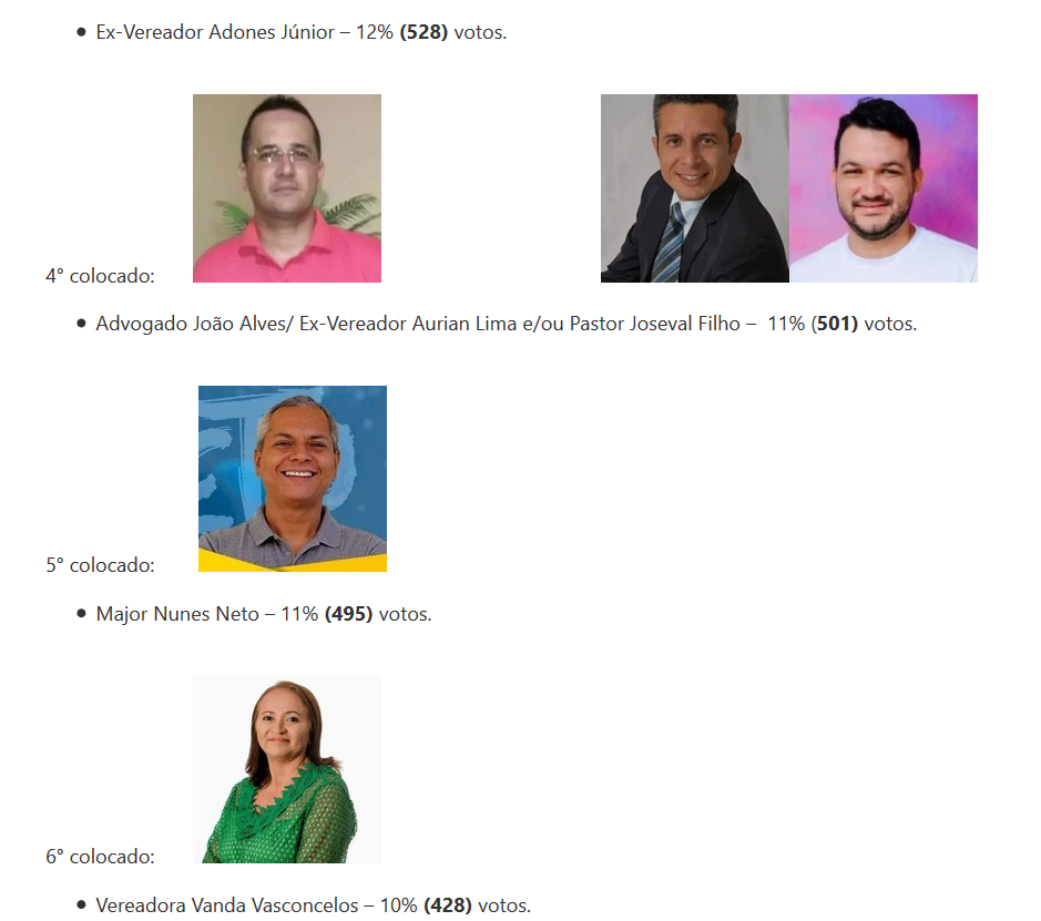 De acordo com a enquete, Zé Paulo aparece com 622 votos. Logo acima está o prefeito Emerson Panta, com 965 votos. Também participaram da enquete Adones, Vanda de Olavo, Dra. Joelma entre outros.